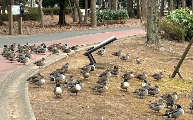 人が来ても、ちっとも逃げず、むしろ人間が鴨をよけて走っている。