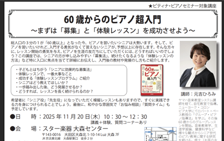 というわけで、特にシニアの「募集法」や「体験レッスン」などに焦点を当てた講座が開かれます。